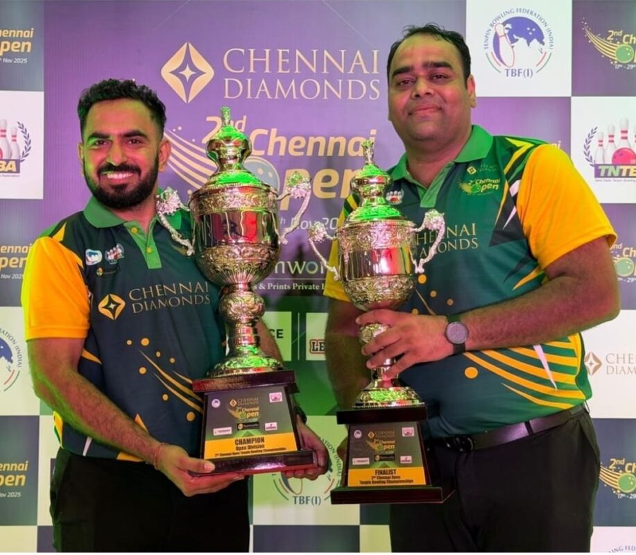 नई दिल्ली – तमिलनाडु के महीपाल सिंह ने द चेन्नई डायमंड्स द्वारा आयोजित दूसरे चेन्नई ओपन टेनपिन बॉलिंग चैंपियनशिप का ख़िताब जीता, जो चेन्नई के लेट्स बॉल में संपन्न हुई। ओपन डिवीजन फाइनल में, जो चैलेंज द लीडर फ़ॉर्मेट पर आधारित था, दूसरी सीड बेवनगोपाल एल ने टॉप सीड महीपाल सिंह के खिलाफ पहला गेम (208–194) जीता, जिससे विजेता तय करने के लिए दूसरे गेम की ज़रूरत पड़ी।दूसरे गेम में महीपाल ने लगातार तीन स्ट्राइक्स के साथ शानदार शुरुआत करते हुए 200 का स्कोर बनाया, जबकि बेवनगोपाल 168 पर रहे और इस तरह महीपाल चैंपियन बने। इससे पहले स्टेपलैडर राउंड के पहले मैच में, तीसरी सीड तमिलनाडु के आनंद बाबू ने चौथी सीड तेलंगाना के निखिल वसुद्दम को 222–183 से हराया। सेमीफाइनल में, पश्चिम बंगाल के बेवनगोपाल लाहोटी ने आनंद बाबू पर आसान जीत (223–191) दर्ज की।डबल्स डिवीजन में, कर्नाटक के परेश अहमद और वकील आर (737 पिन) ने तमिलनाडु के गुरुनाथन और सोबन डी (735 पिन) के खिलाफ रोमांचक फाइनल में केवल 2 पिन के अंतर से जीत दर्ज की।दो गेमों के कुल पिनफॉल पर आधारित टाइटल मैच के पहले गेम में, चौथी सीड परेश–वकील (386) ने तीसरी सीड गुरुनाथन–सोबन (385) पर 1 पिन की बढ़त बनाई। दूसरे गेम में दोनों टीमों ने बढ़त हासिल करने के लिए जी-जान से संघर्ष किया, और अंतिम फ्रेम में वकील आर की एक स्ट्राइक ने कर्नाटक की टीम (351–350) के लिए खिताबी जीत सुनिश्चित कर दी। ग्रेड ए डिवीजन में, शीर्ष 12 प्रतिभागियों ने विजेता तय करने के लिए मास्टर्स राउंड में 8-गेम का ब्लॉक खेला। 8 गेमों के अंत में, तमिलनाडु के गुरुनाथन 1556 के प्रभावशाली कुल पिनफॉल और 194.50 के औसत के साथ शीर्ष पर रहे। तमिलनाडु के ही आनंद बाबू 1544 के कुल पिनफॉल और 193.00 के औसत के साथ दूसरे स्थान पर रहे। कर्नाटक के सतीश ए जी 1485 के कुल पिनफॉल के साथ तीसरे स्थान पर रहे। ग्रेड-बी डिवीजन में, महाराष्ट्र के मोहम्मद चौहान ने 8 गेमों में 1471 के कुल पिनफॉल और 183.88 के औसत के साथ मास्टर्स राउंड जीता।दिल्ली के कुलदीप केएस ने 1429 के कुल पिनफॉल (औसत 178.63) के साथ दूसरा स्थान हासिल किया। उत्तर प्रदेश के आनंद कुमार आर 1407 (औसत 175.88) के साथ तीसरे स्थान पर रहे। इस चैंपियनशिप में 10 राज्यों के लगभग 95 गेंदबाज़ों ने बारह दिनों तक उच्च-स्तरीय गेंदबाज़ी का प्रदर्शन किया।